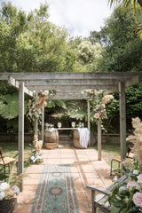Two of the most lovely people to organise a wedding with, Tyne and Dan were going for a relaxed, at-home but Boho themed. As the wedding was in the backyard and later throughout the house and balcony, the flowers had to really play a big part in creating not only a wedding ceremony area but a boho-theme throughout the different areas. So with careful placement of vases, wine barrels, buckets and rugs and together with the soft coloured blooms and toetoe it looked amazing.